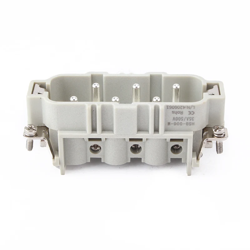 HSB-006-M HSB Heavy duty konnektorer arbejder under 35A strøm .35A 6 Pin Insert Heavy Duty Connector er 6 ben eller dobbelt 12 ben til kontakt med ledninger. Det er tilbud til forskellige arbejdsforhold og populært brugt i automatiske industrier og typer af maskinens ledningsforbindelse.
