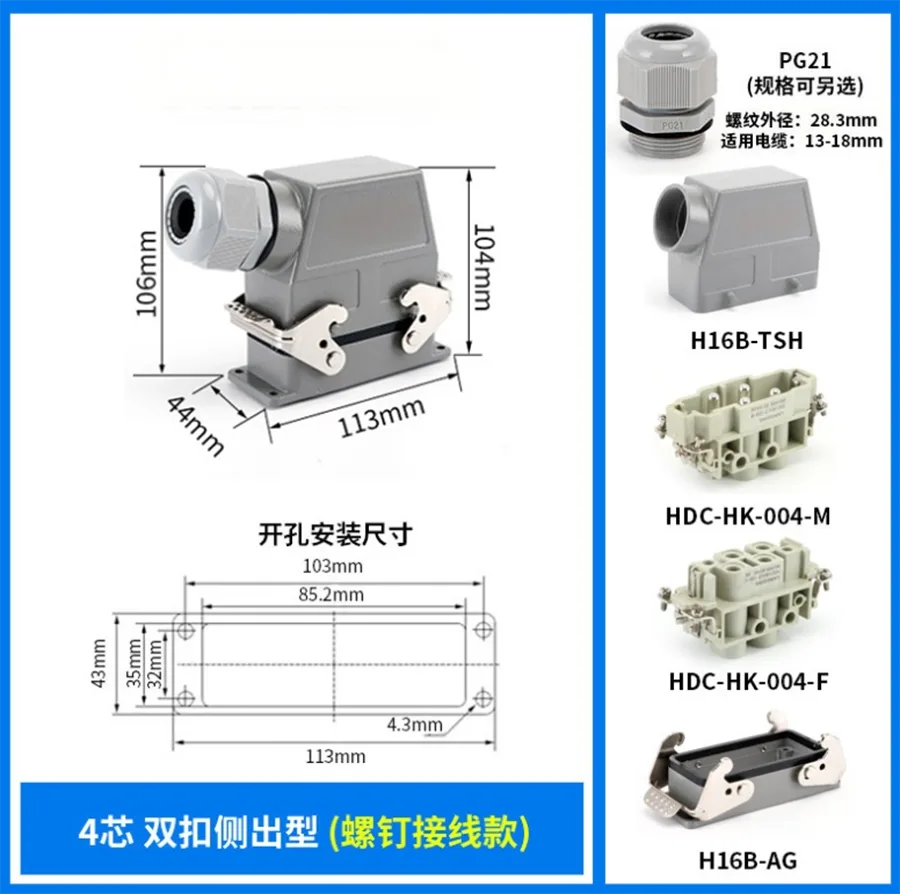 HK-004/0-M HK Heavy duty stik arbejder under 80A strøm. Det er 4 ben til kontakt med ledninger. Det er tilbud til forskellige arbejdsforhold og populært brugt i automatiske industrier og typer af maskinens ledningsforbindelse.
