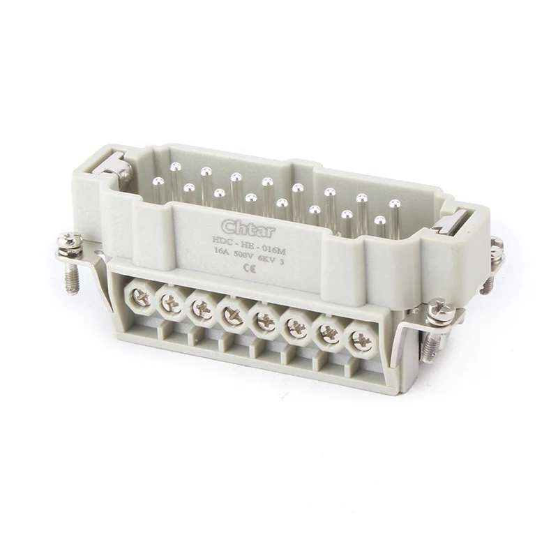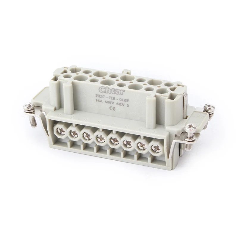 M/F 16 Pin Insert Heavy Duty Connectors er indsatsdele, der monteres i aluminiumshus kraftige konnektorer HDC-HE-016. Indsæt kraftige stik er lavet af pc og messingstifter. CHTAR messingstifter er sølvbelagte. Det er han- og hundele, der skal forbindes. Det skal også samles i husdelen for at gøre dem IP65-beskyttelse.